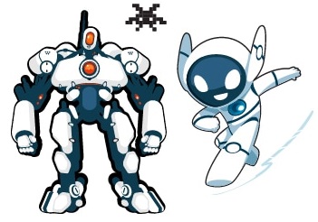 (image of yellow happy face ribbon, Cybot's smiling head, cursor arrows and password fields)