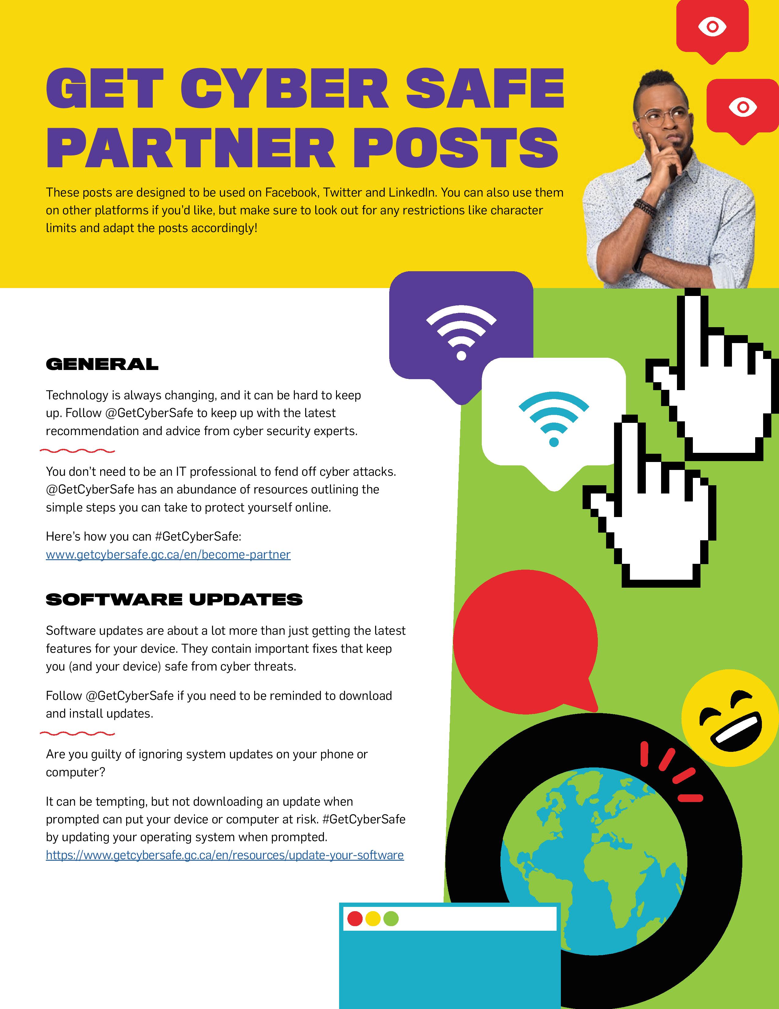 As a Get Cyber Safe partner, you’re free to get creative with your posts, too. To help you craft your content, we’ve created four fact sheets you can look at for inspiration. You can also check out the Get Cyber Safe resources page for videos, infographics and other sharables to use on your social channels.