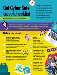 Packing for a vacation can feel stressful but being cyber safe for your trip shouldn’t be. Securing your devices before, during, and even after your trip is an important part of travelling to prevent cyber attacks, like malware, from compromising your personal or financial information.