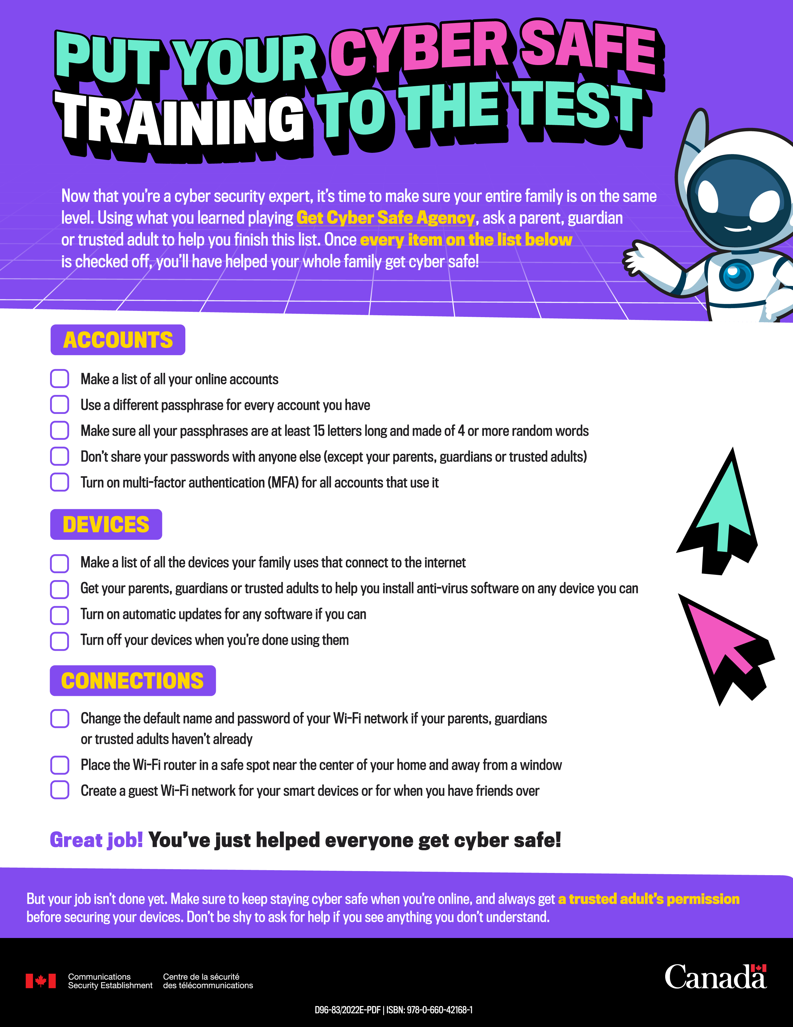 Now that you’re a cyber security expert, it’s time to make sure your entire family is on the same level. Using what you learned playing Get Cyber Safe Agency, ask a trusted adult to help you finish this list. Once every item on the list below is checked off, you’ll have helped your whole family get cyber safe!