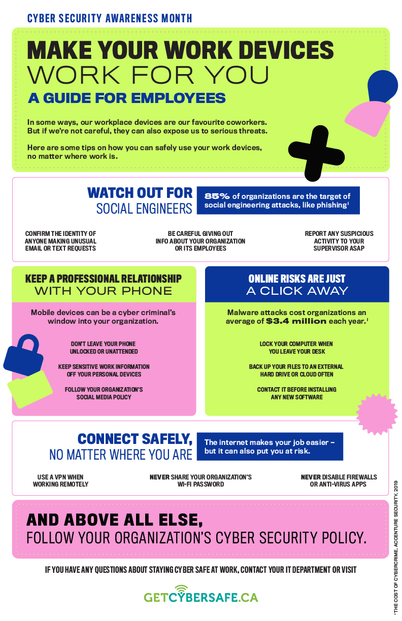 If you have any questions about staying cyber safe at work, contact your IT department or visit GETCYBERSAFE.CA