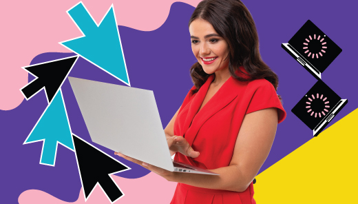 "a person sitting with a laptop, with update circles and cursor arrows"