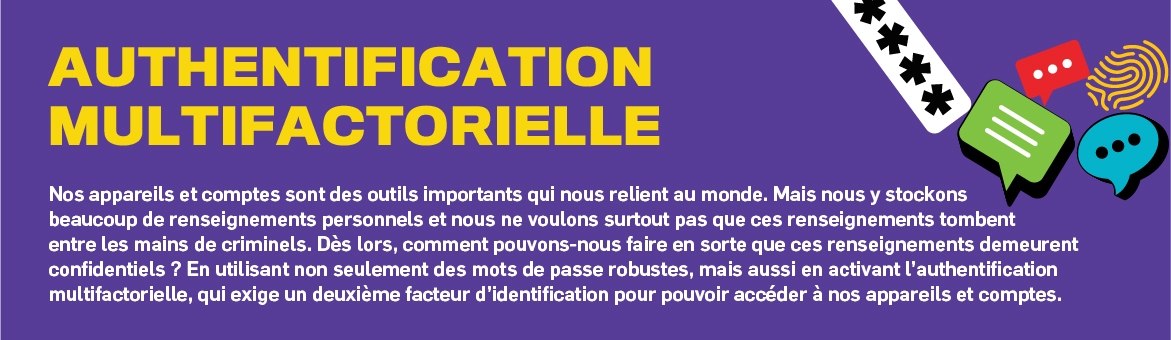 Nos appareils et comptes sont des outils importants qui nous relient au monde. Mais nous y stockons beaucoup de renseignements personnels et nous ne voulons surtout pas que ces renseignements tombent entre les mains de criminels. Dès lors, comment pouvons-nous faire en sorte que ces renseignements demeurent confidentiels ? En utilisant non seulement des mots de passe robustes, mais aussi en activant l’authentification multifactorielle , qui exige un deuxième facteur d’identification pour pouvoir accéder à nos appareils et comptes.