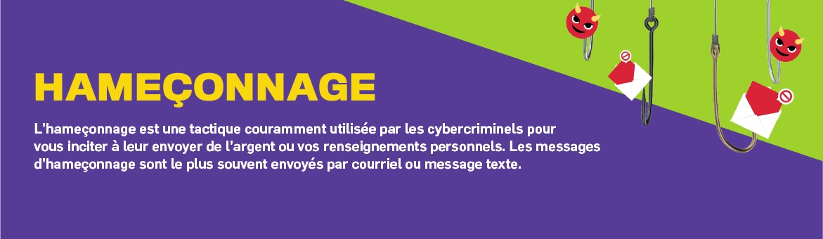 L’hameçonnage est une tactique couramment utilisée par les cybercriminels pour vous inciter à leur envoyer de l’argent ou vos renseignements personnels. Les messages d’hameçonnage sont le plus souvent envoyés par courriel ou message texte.