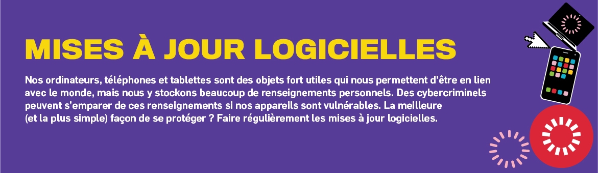 Nos ordinateurs, téléphones et tablettes sont des objets fort utiles qui nous permettent d’être en lien avec le monde, mais nous y stockons beaucoup de renseignements personnels. Des cybercriminels peuvent s’emparer de ces renseignements si nos appareils sont vulnérables. La meilleure (et la plus simple) façon de se protéger ? Faire régulièrement les mises à jour logicielles.