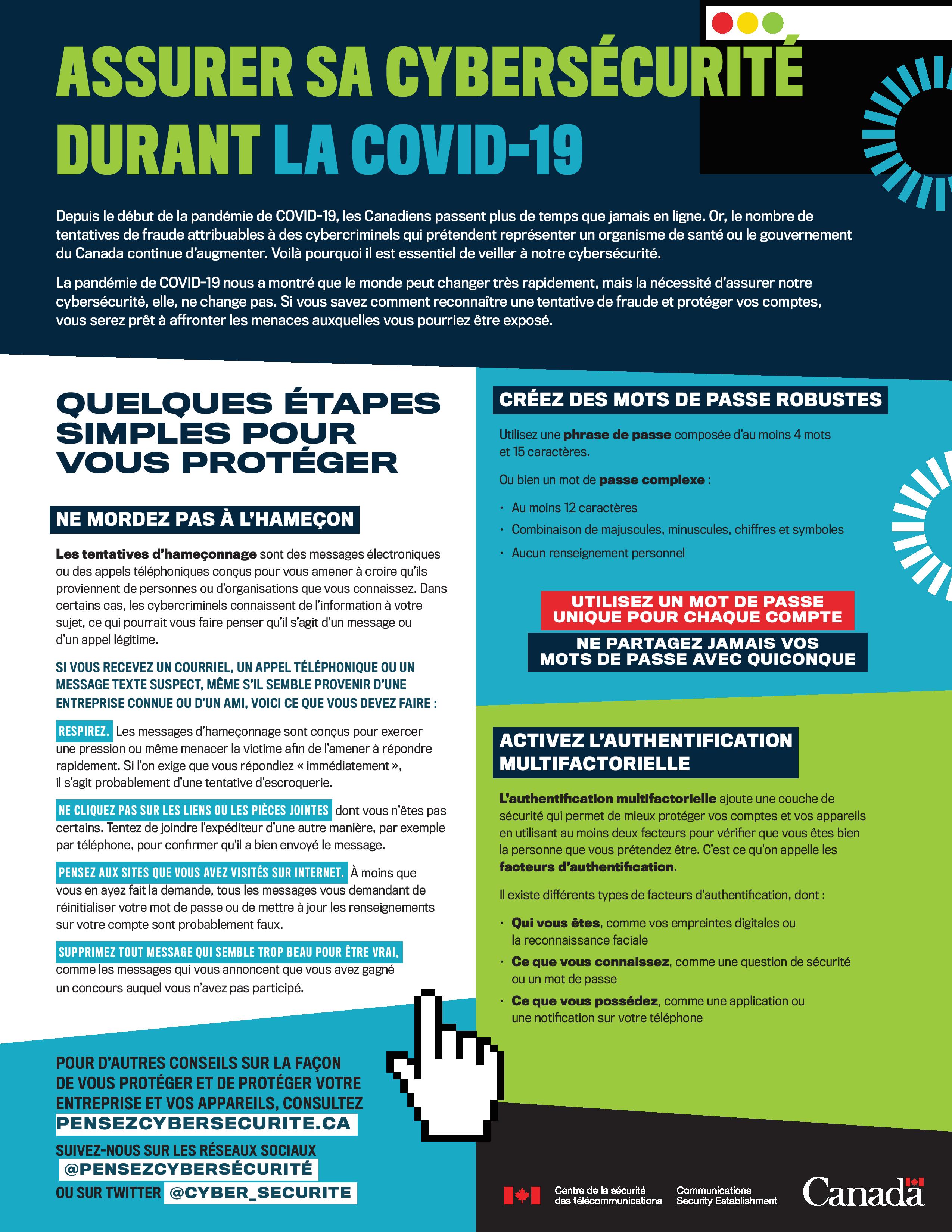 Depuis le début de la pandémie de COVID-19, les Canadiens passent plus de temps que jamais en ligne. Or, le nombre de tentatives de fraude attribuables à des cybercriminels qui prétendent représenter un organisme de santé ou le gouvernement du Canada continue d’augmenter. Voilà pourquoi il est essentiel de veiller à notre cybersécurité.
