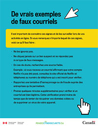 • En cas de doute, recherchez une source fiable. Exemple : si vous recevez un courriel affirmant que votre compte Netflix n'a pas été payé, consultez le site officiel de Netflix et téléphonez au numéro de téléphone qui y est inscrit pour vérifier.