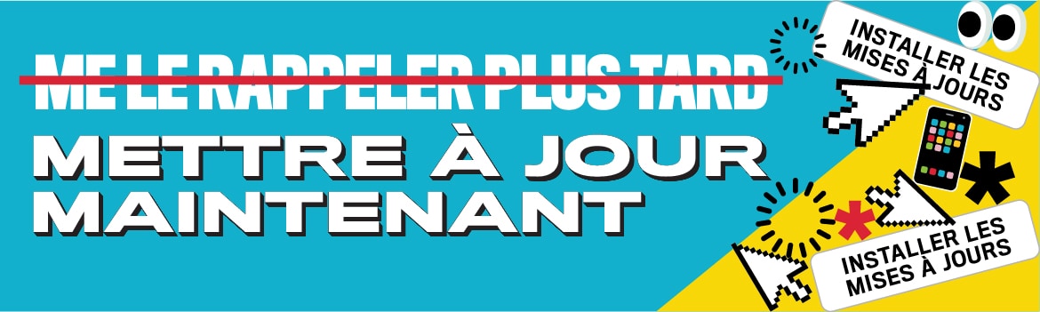 TEXTE SUR ÉCRAN: N’attendez pas qu’il soit trop tard. Installez les mises à jour de logiciel dès qu’elles sont disponibles. #PensezCybersécurité